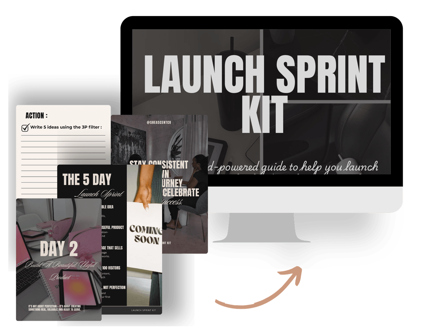 Inside the Launch Sprint Kit, you won’t find fluff or overwhelm. You’ll follow a proven, feminine-powered method to go from “no idea” to launched and selling — in just 5 focused days.